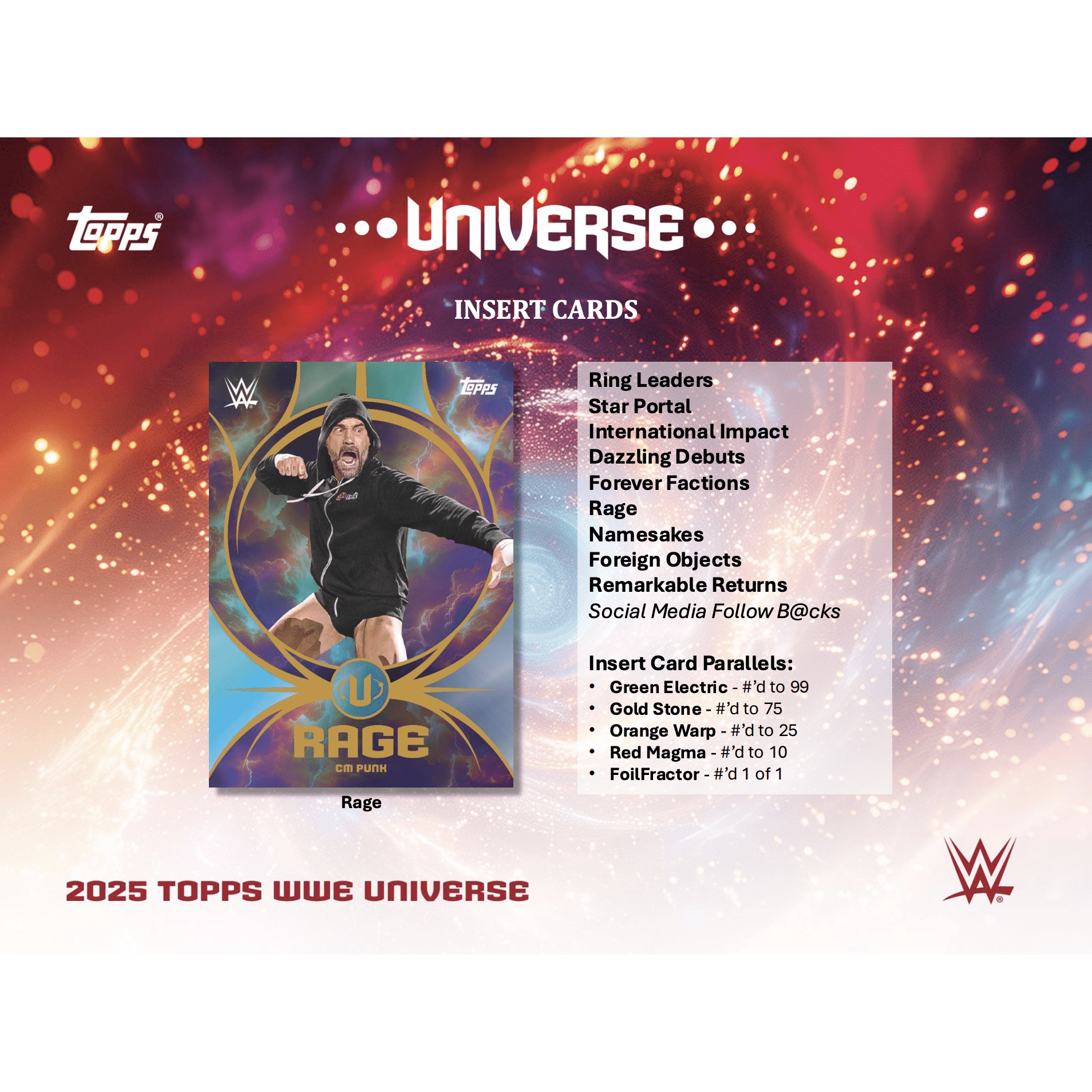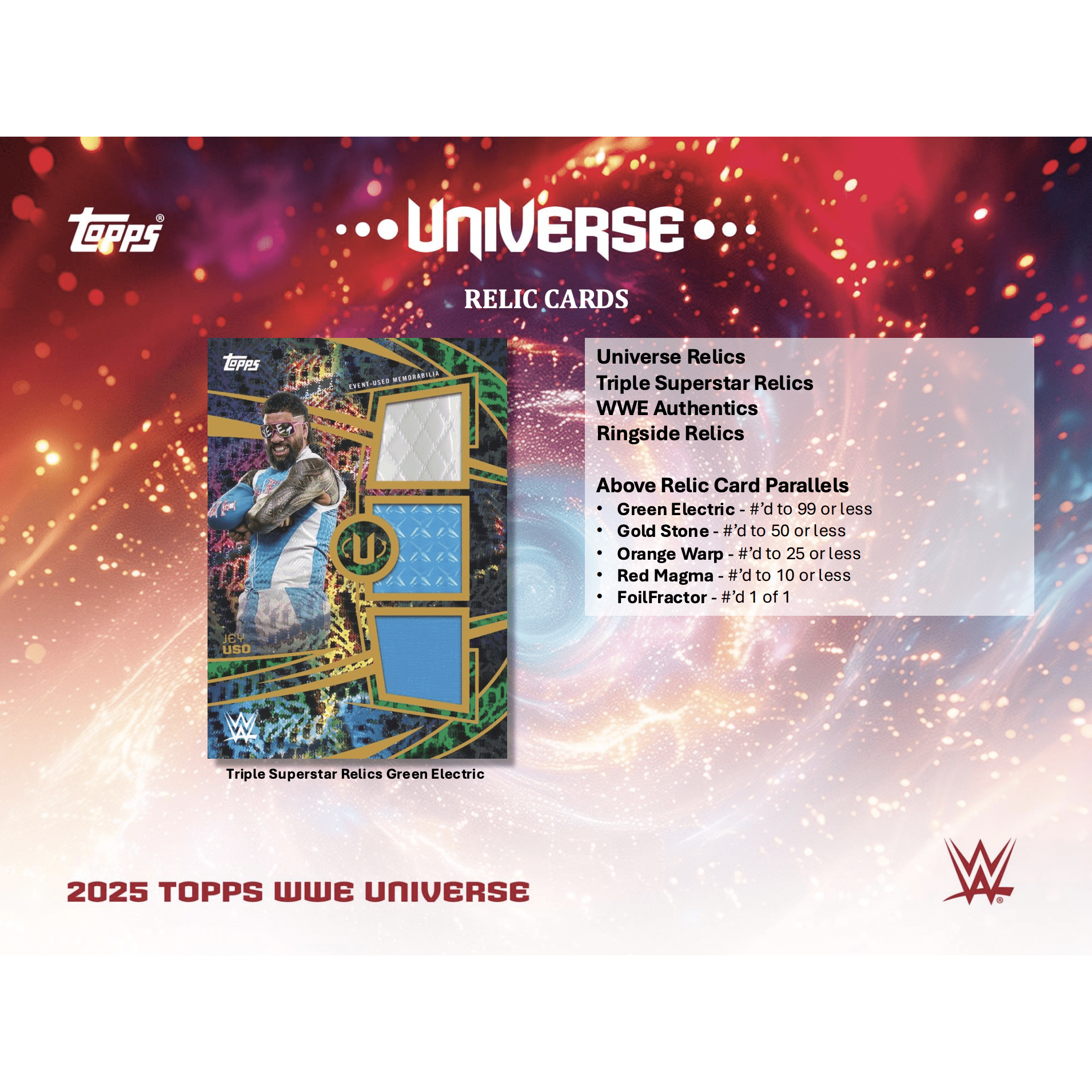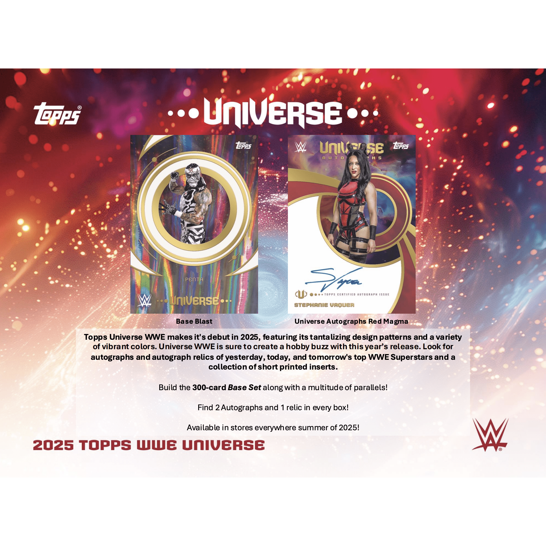 Topps Universe WWE makes its debut in 2025 with bold, eye-catching designs and a vibrant color palette that brings WWE Superstars to life. This release delivers a dynamic mix of current stars, legends, and future icons, combined with short-printed inserts, autographs, relics, and premium parallels that create serious chase value pack after pack.