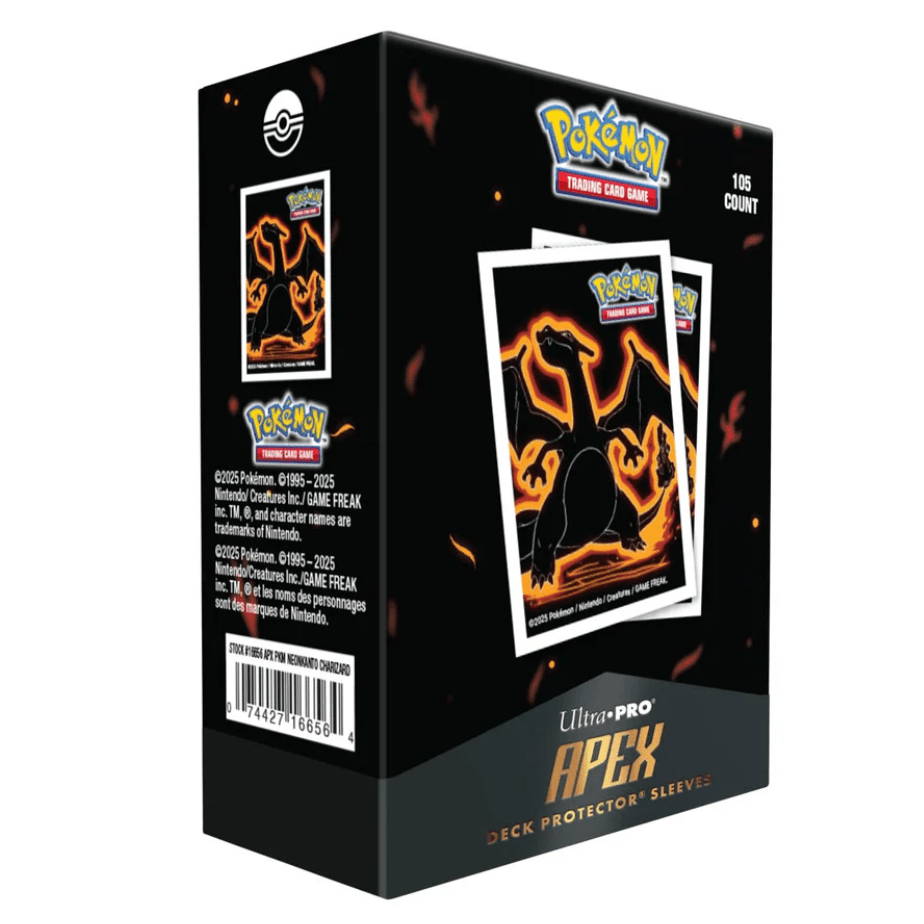 The 105ct APEX Deck Protector Sleeves for the Pokémon Trading Card Game are engineered with a new easy-shuffle formulation and premium construction designed for consistent, tournament-ready performance. Each pack showcases bold character artwork—Charizard, Venusaur, or Blastoise—emerging from a dramatic dark backdrop on a textured sleeve back, delivering both visual impact and reliable grip during gameplay. Archival-safe, acid-free polypropylene materials ensure long-term protection, while the gloss-clear front preserves card clarity and lets foil treatments stand out. These sleeves are sized precisely for standard 2.5 in. x 3.5 in. trading cards, providing a snug, secure fit.