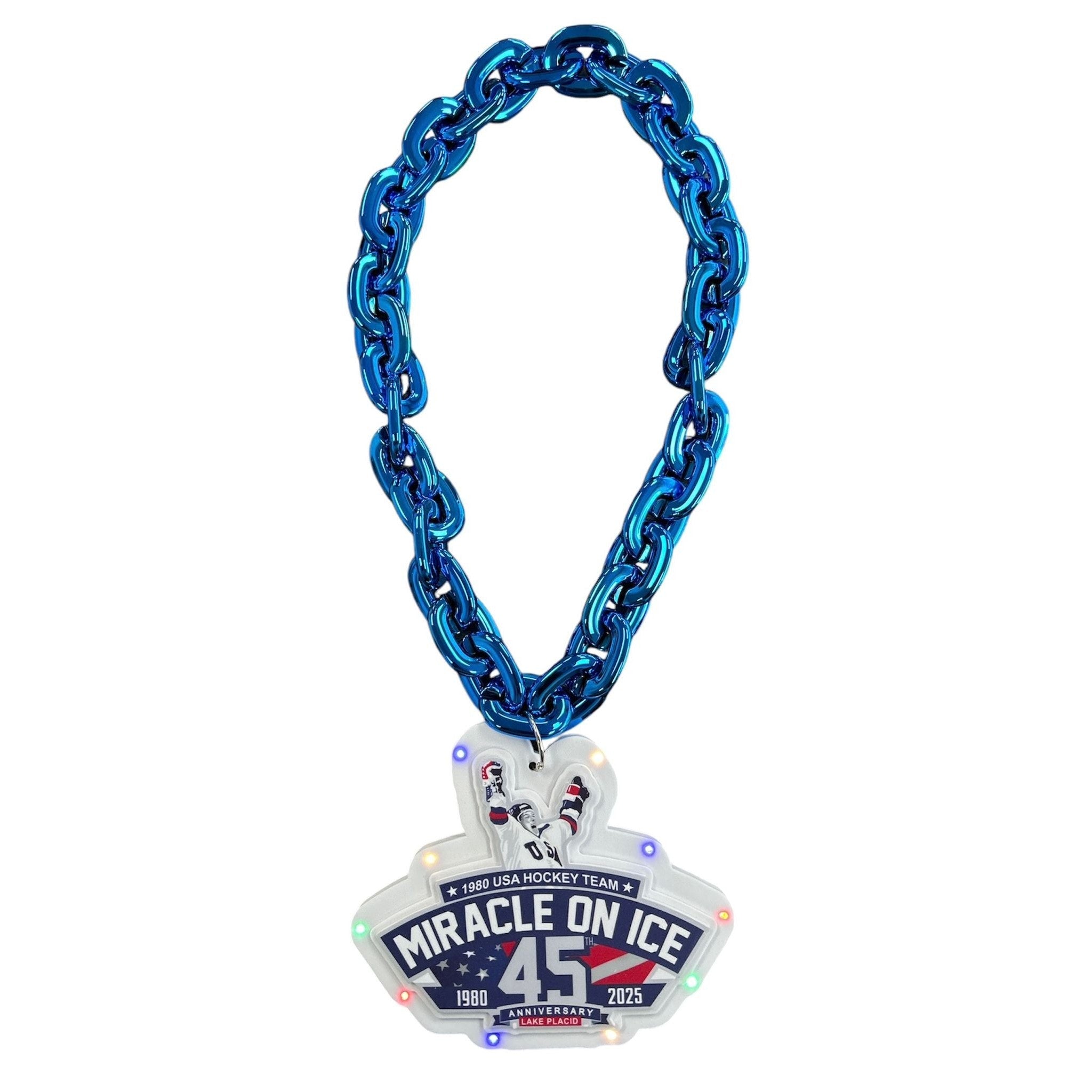 Fandom so bright, you’re going to need shades! Get ready to light things up on gamedays and beyond with the1980 Miracle on Ice 45th Anniversary Big Logo Chain Necklace.
