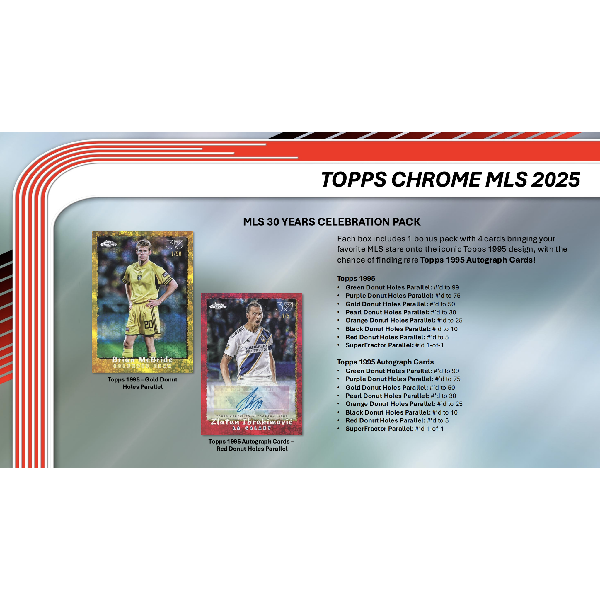Celebrate the 30th Anniversary of Major League Soccer with 1 bonus MLS 30 Years Celebration Pack per box! Each bonus pack includes 4 cards on the iconic Topps 1995 design, with the chance of finding rare Topps 1995 Autograph Cards.
