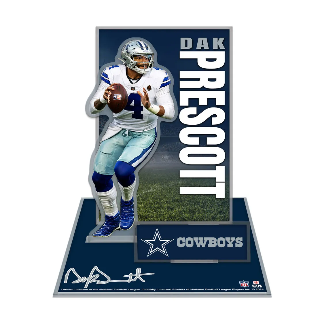 The Dak Prescott Acrylic Stand-Up Set captures the energy and leadership of the Cowboys quarterback in a bold 3D display. Officially licensed and made in the USA, this collectible adds a professional, high-quality touch to any sports collection or fan space.